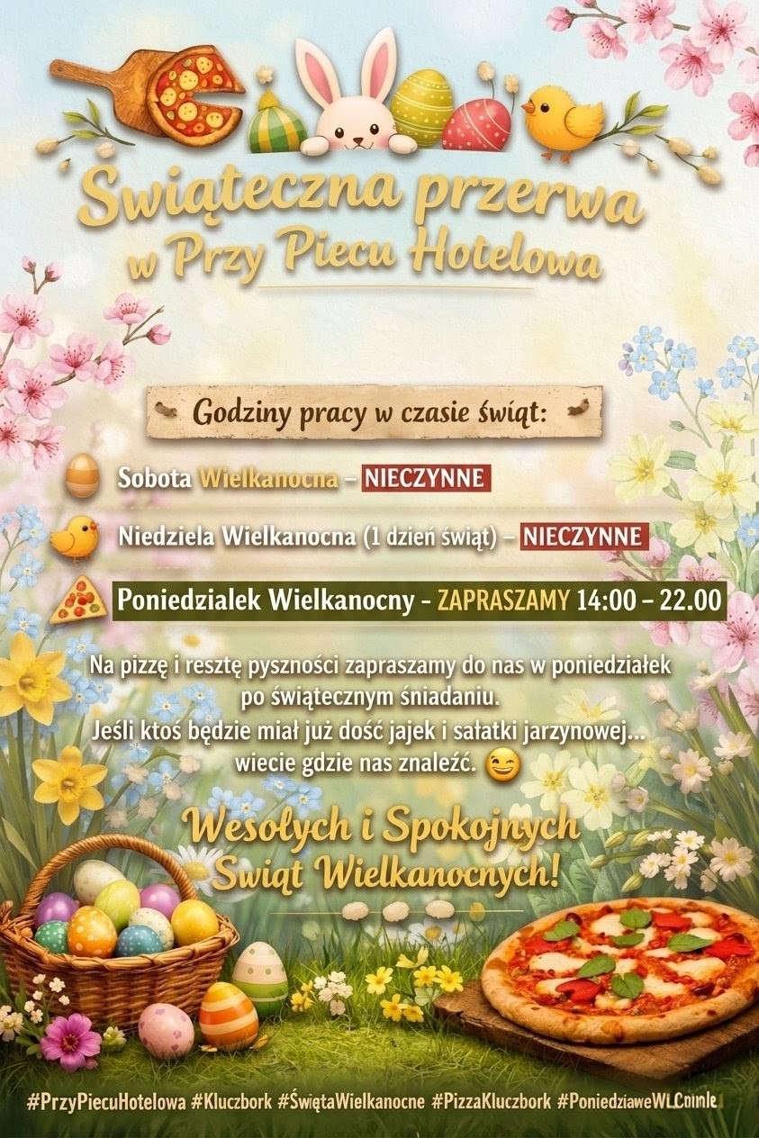Za to w Lany Poniedziałek zapraszamy na gorącą pizzę! 🍕🔥 14:00–22:00 czekamy na Was w Przy Piecu Hotelowa. Do zobaczenia po świątecznym śniadaniu! 😉